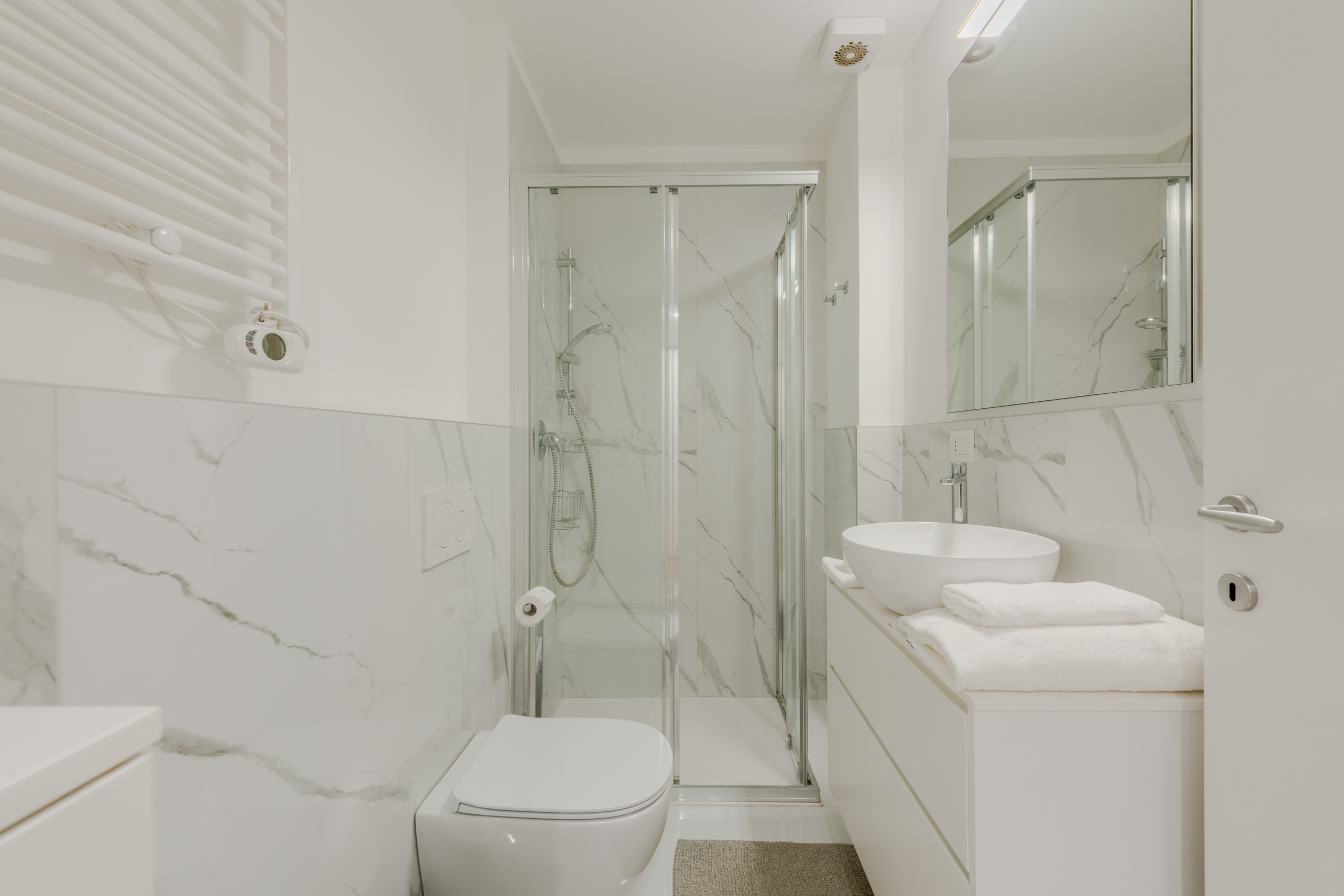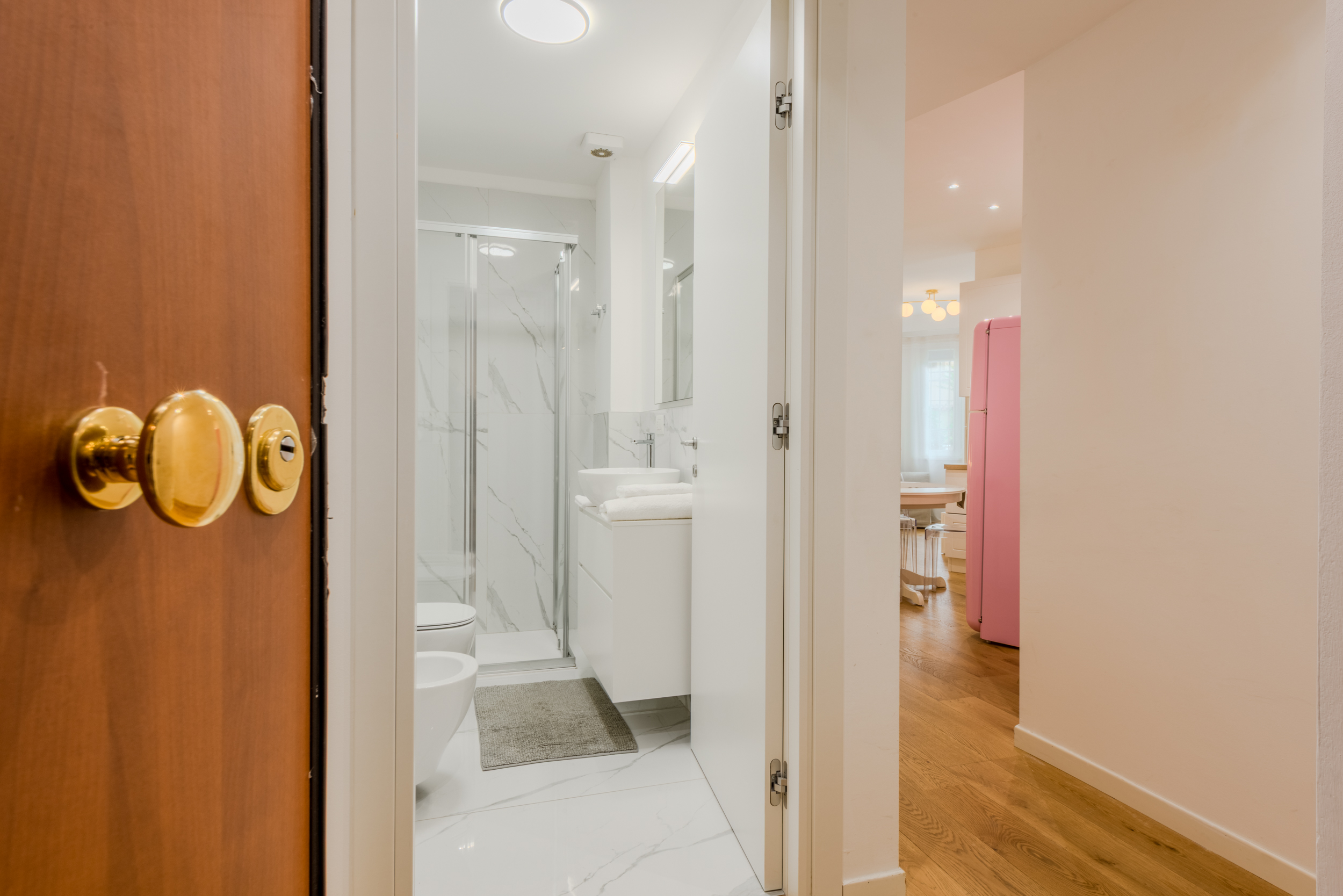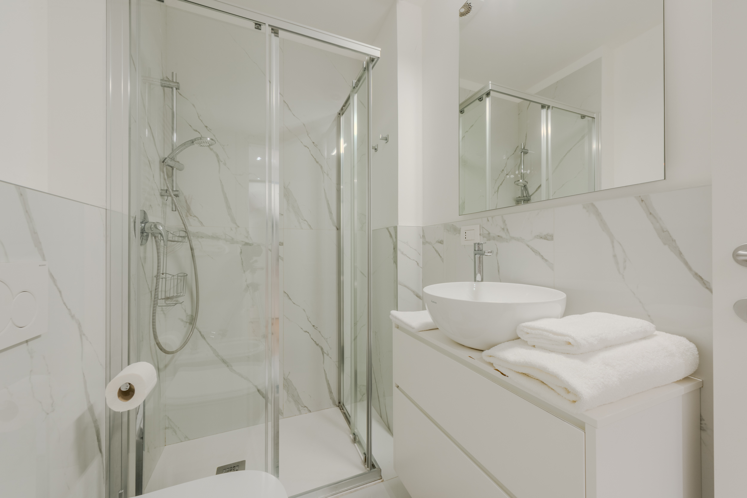 L’appartamento dispone di un bagno moderno con doccia, un letto matrimoniale e un divano con TV per momenti di relax.